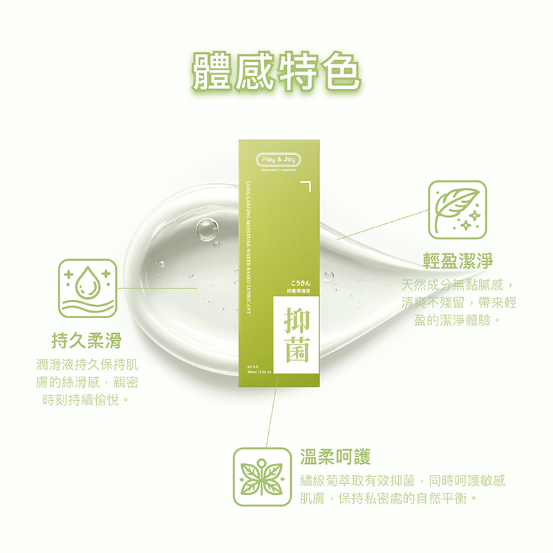 play & joy抑菌型潤滑液, 除潤滑效果外, 再加上獨特配方, 讓你在做愛時能有基本的抑菌效果。