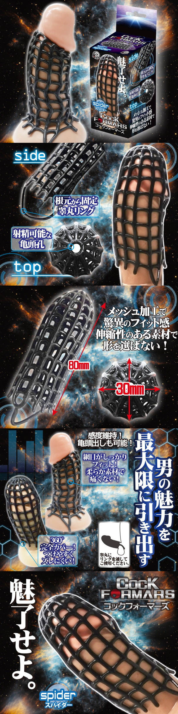 スパイダーは、蜘蛛の巣上状の網目が全体を覆う様に包み込み、驚異のフィット感を実現。睾丸にリングも通せるので勃起力もアップ!!