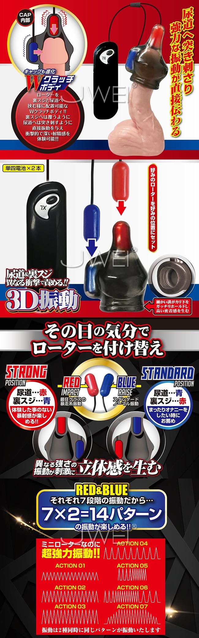 亀頭へ振動刺激を与えることでイキまくる新しいオナニーをお届けいたします。 異なる強さの振動が、亀頭への刺激に立体感を生み、衝撃的な射精感を実現したダブルインパクト。 尿道へ突き刺さるような形状でローターを装着し、ジンジン響くような振動刺激が楽しめます。さらに、もう一つのローターは裏スジを刺激しやすい場所に装着します。 ローターを裏スジと尿道で挟みこむようなダブルクラッチだから、深い射精感が体験可能になりました。 青いローターは、スタンダードなノーマル振動。赤いローターは最狂クラスの暴走系振動。 まったりとオナニーを楽しみたい時には、青を尿道へ赤を裏スジへ装着してください。また、暴射精感を堪能したい時には、赤を尿道へ青を裏スジへ装着してお楽しみ下さい。 かなりミニサイズのローターですが、7種類のパターンを搭載しています。ダブルローターだから、7パターンx2個で、14パターンを楽しめちゃいます。 取外し可能なローターだから、ローターのみでお使いいただくことも可能です