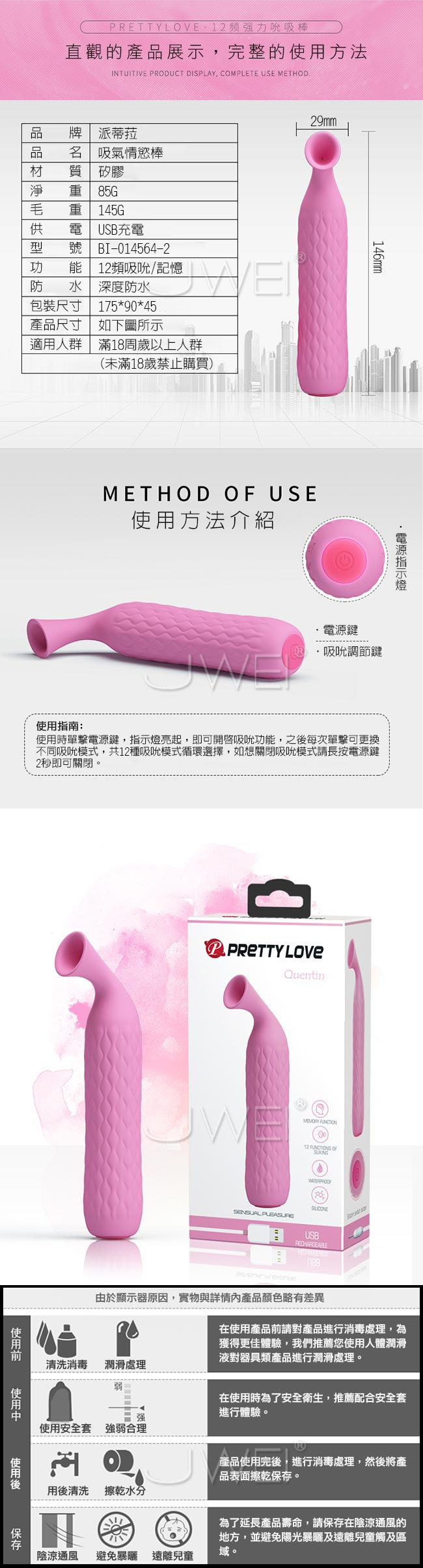 ►您現在的位置:首頁>Pretty Love.Quentin 12段變頻吸吮震動防水吸氣情欲按摩棒-粉紅色