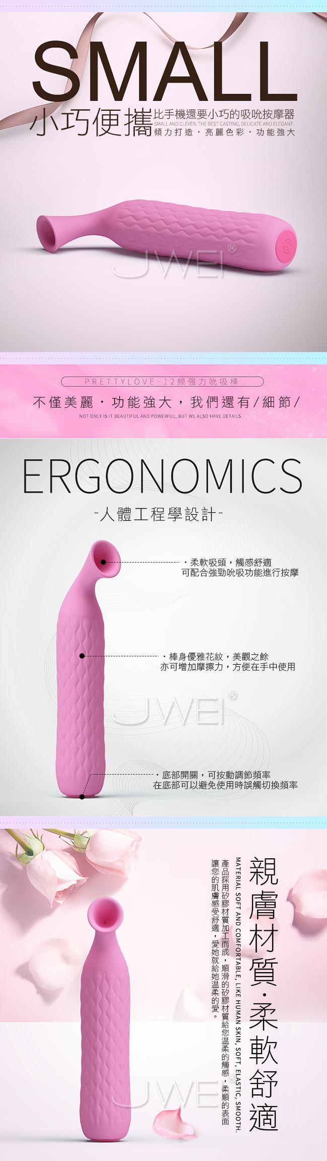 輕靈美感與純靜顏色合而為一強大的功能告訴你它不是一個花瓶!強力時尚吸吮按摩棒擁有12段變頻模式等您來切換,彷彿愛人的蜜唇般充滿魔力讓您欲罷不能!!小巧便攜的造型方便外出攜帶,小巧的吸吮按摩器功能強大,讓您出門在外也能滿足自己的慾望。符合人體工程學設計柔軟親膚材質吸頭,觸感舒適可配合強勁吸吮進行按摩,棒身優雅溫花紋美觀同時增加摩擦力方便手中使用!底部開關設計可調節頻率避免誤觸切換頻率。採用防水設計,方便清洗讓您在浴室裡也能使用享魚水之歡唷~靜謐低噪設計讓您在安靜環境內盡享愛的私密空間!USB充電續航方便,支持多種方式充電無論何時何地讓快樂不斷電!