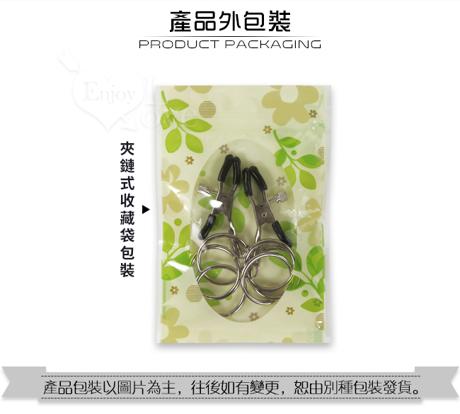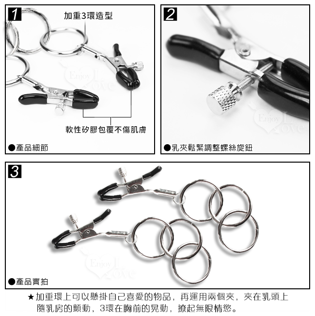 加重環上可以懸掛自己喜愛的物品,再運用兩個夾,夾在乳頭上,隨乳房的顫動,3環在胸前的晃動,撩起無限情慾。