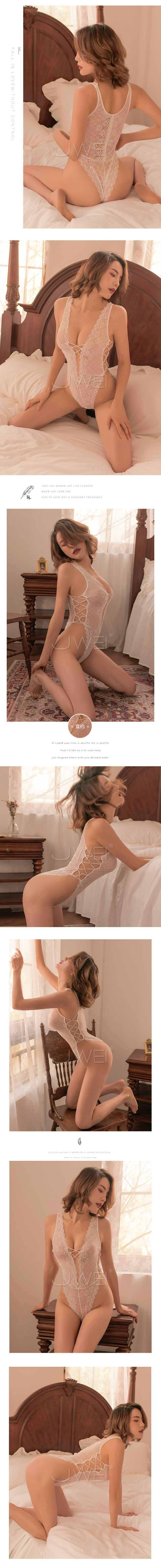| 牢牢相繫.性感透視蕾絲深V高衩連體衣-白色