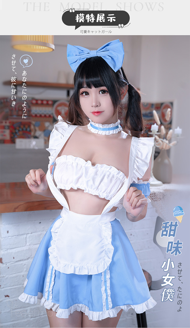 ►您現在的位置:首頁>女僕角色扮演服!清新藍白荷葉花邊開衩裙襬蝴蝶結點綴七件式套裝