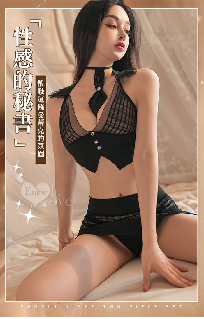 ►您現在的位置:首頁>秘書角色扮演服!網紗V字格紋透視短裙四件式套裝﹝黑﹞