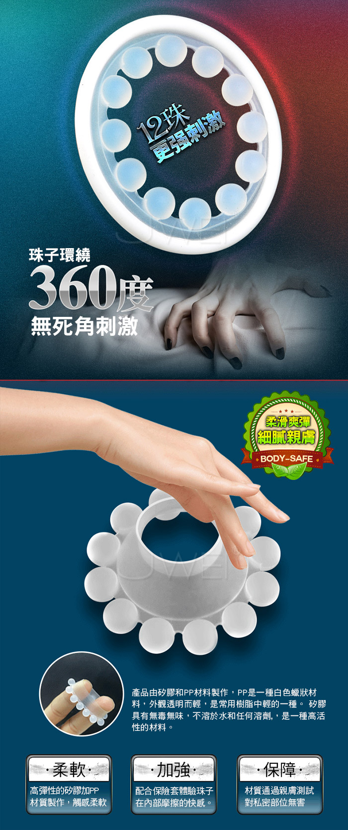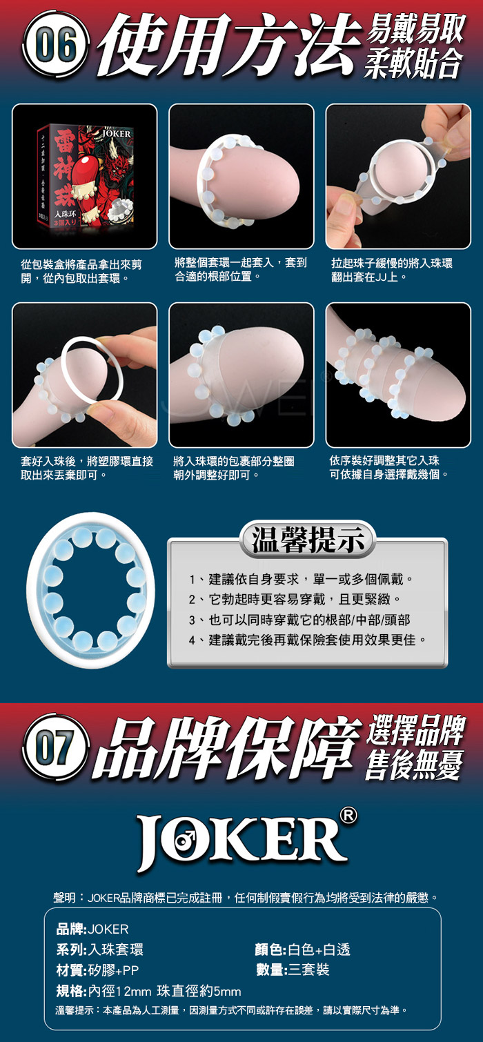 十二珠入珠套環粗壯硬漢,搞得她高潮迭起;十二珠環 繞,360度無死角刺激,易戴易取,柔軟爽彈,細膩親膚 ;容易清潔循環使用,建議戴完入珠環後再戴保險套使 用效果更佳。