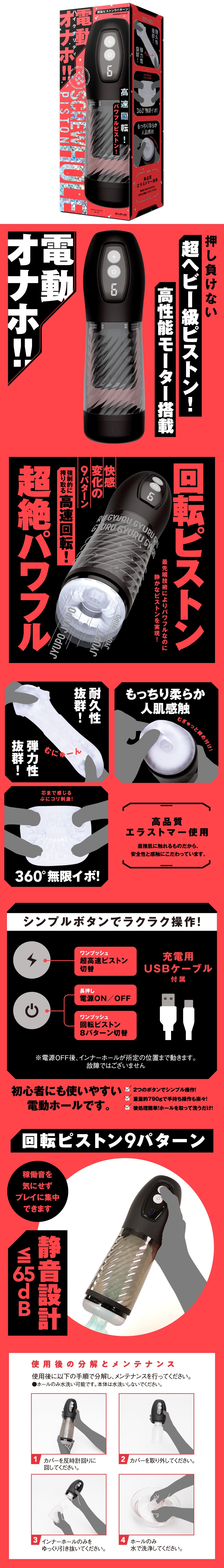 配有高速旋轉強力活塞的高品質電動自慰器登場!9 種快感變化模式,讓您享受永遠不會感到膩味的性愛體驗。超重量級活塞搭配高性能馬達,不會讓您失望!強行榨汁的高速旋轉讓人痛苦並快樂著!採用尖端技術,強大而安靜的設計實現了≤65dB的安靜活塞!您可以專心的享受,無需擔心操作噪音。即使對於初學者來說也很容易使用的飛機杯。簡單的雙按鈕允許單手操作。使用後的處理也非常簡單,只需拆下內套並清洗。重量約790公克,方便握在手中。 由於會直接接觸皮膚,因此我們使用高品質彈性體,並著重於安全性和觸感。卓越的彈性和耐用性。觸感柔軟細膩,人體肌膚觸感的插入口及360度的無限肉粒Q彈刮蹭刺激直達核心,比真實的還要刺激!內附USB充電線。審查編號:2304843
