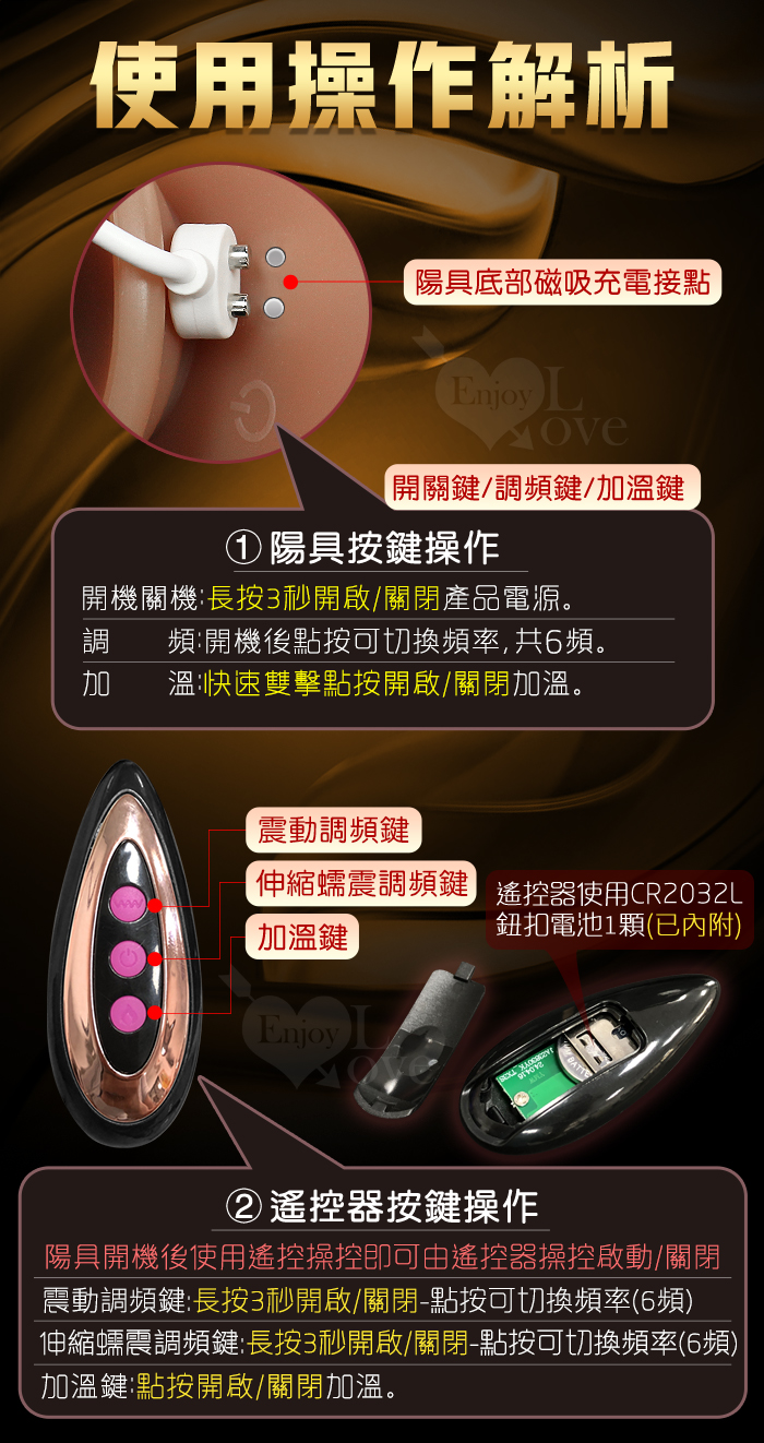 ►您現在的位置:首頁>帝王之軀 ‧ 無線遙控智能加溫肉感逼真吸盤陽具﹝6頻伸縮蠕動+酥震/智能加溫/USB磁吸充電﹞