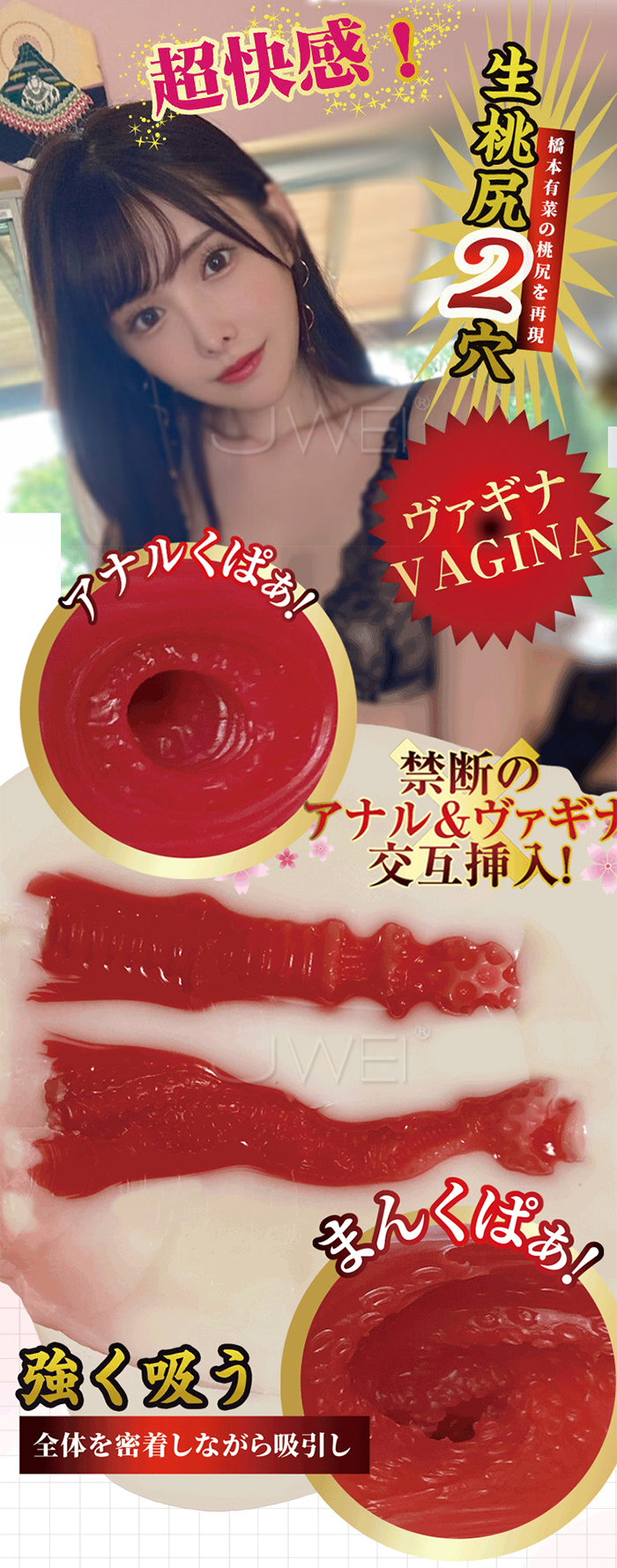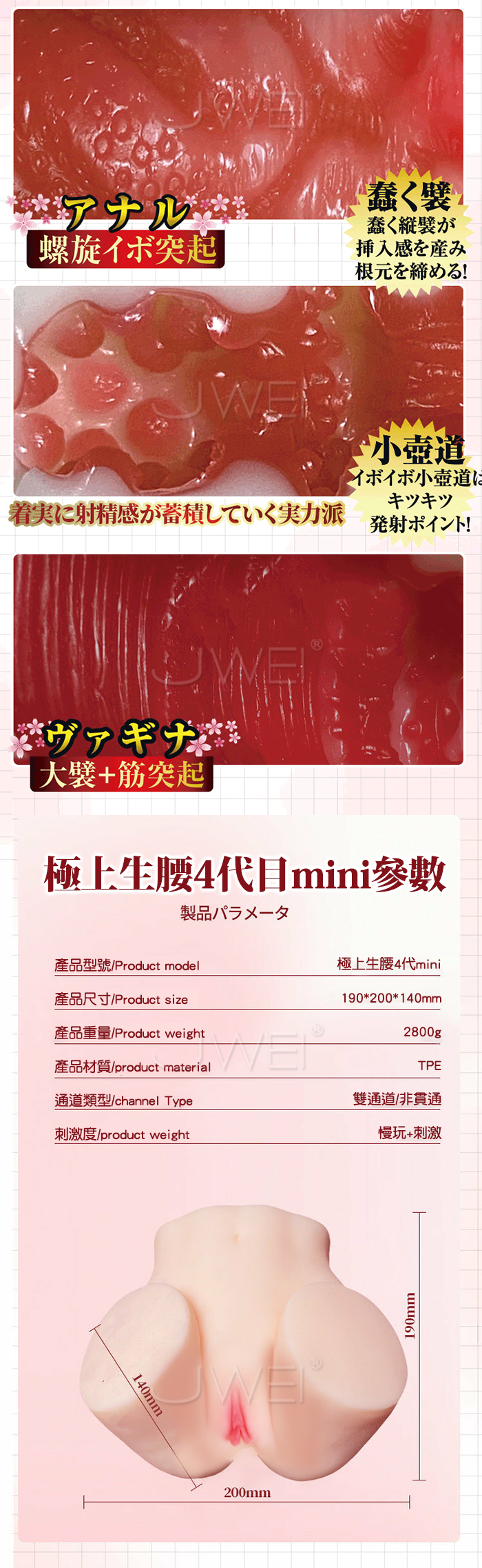 雖然是迷你的尺寸,但仍然有 2800g 重,肉感十足。而且分別有陰道與後庭兩個道通,雙穴的結構複雜,充滿肉粒與橫紋等刺激,讓你可完全感受與橋本交纏的快感,是一款非常令人滿意的作品!