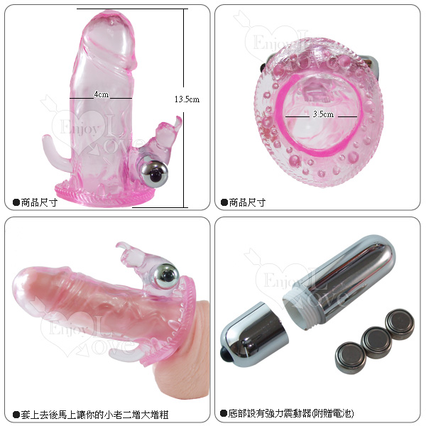 仿真造型,只要在陰莖套上此品,便讓老二馬上成了震動型,它振動按摩力道強勁,再加上凸刺激頭,可刺激女生外陰部及後庭..,男性戴上它,馬上讓你的小老二增長又增粗,而且能百戰不洩,讓心愛的她更滿意,讓你更有自信!